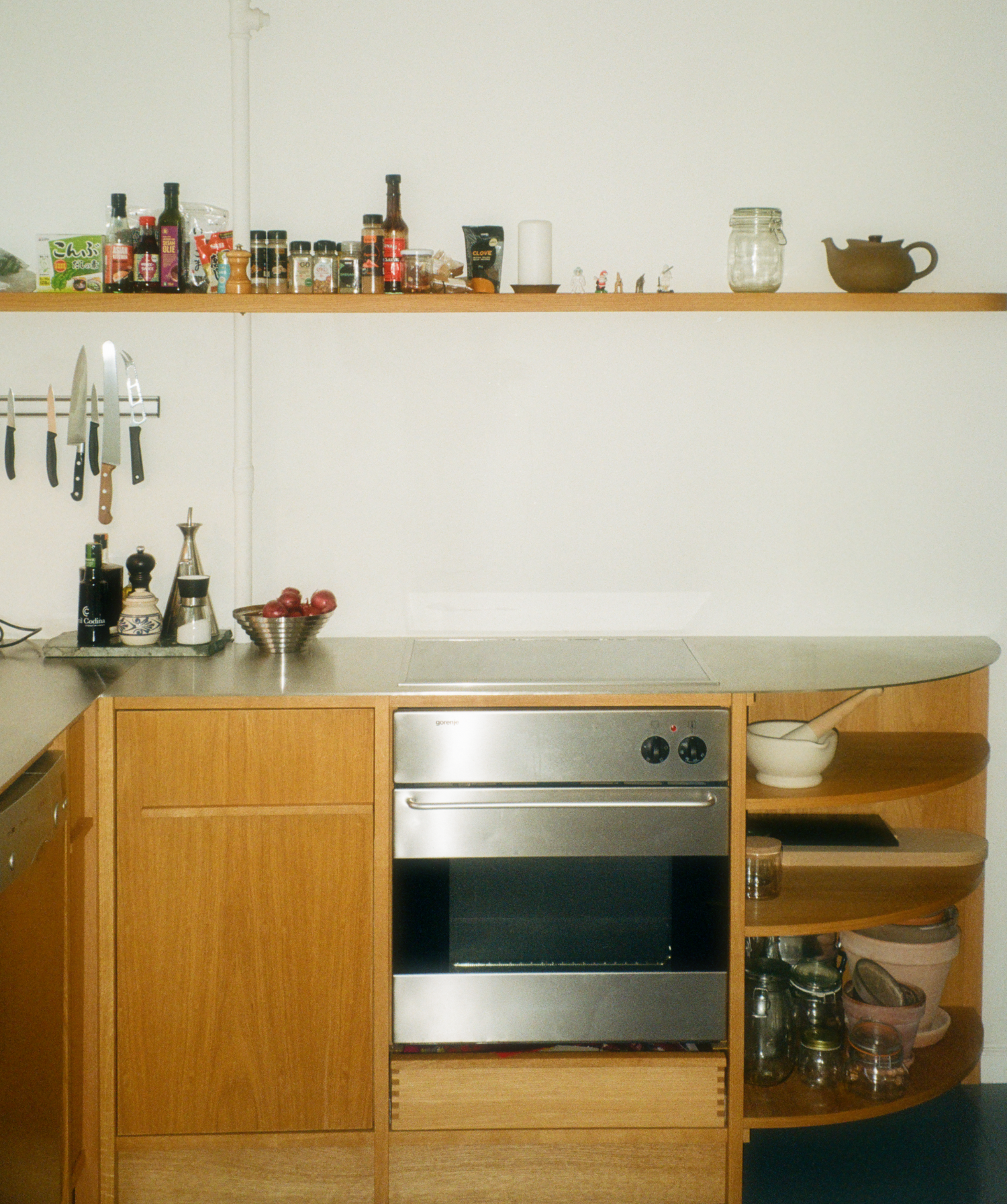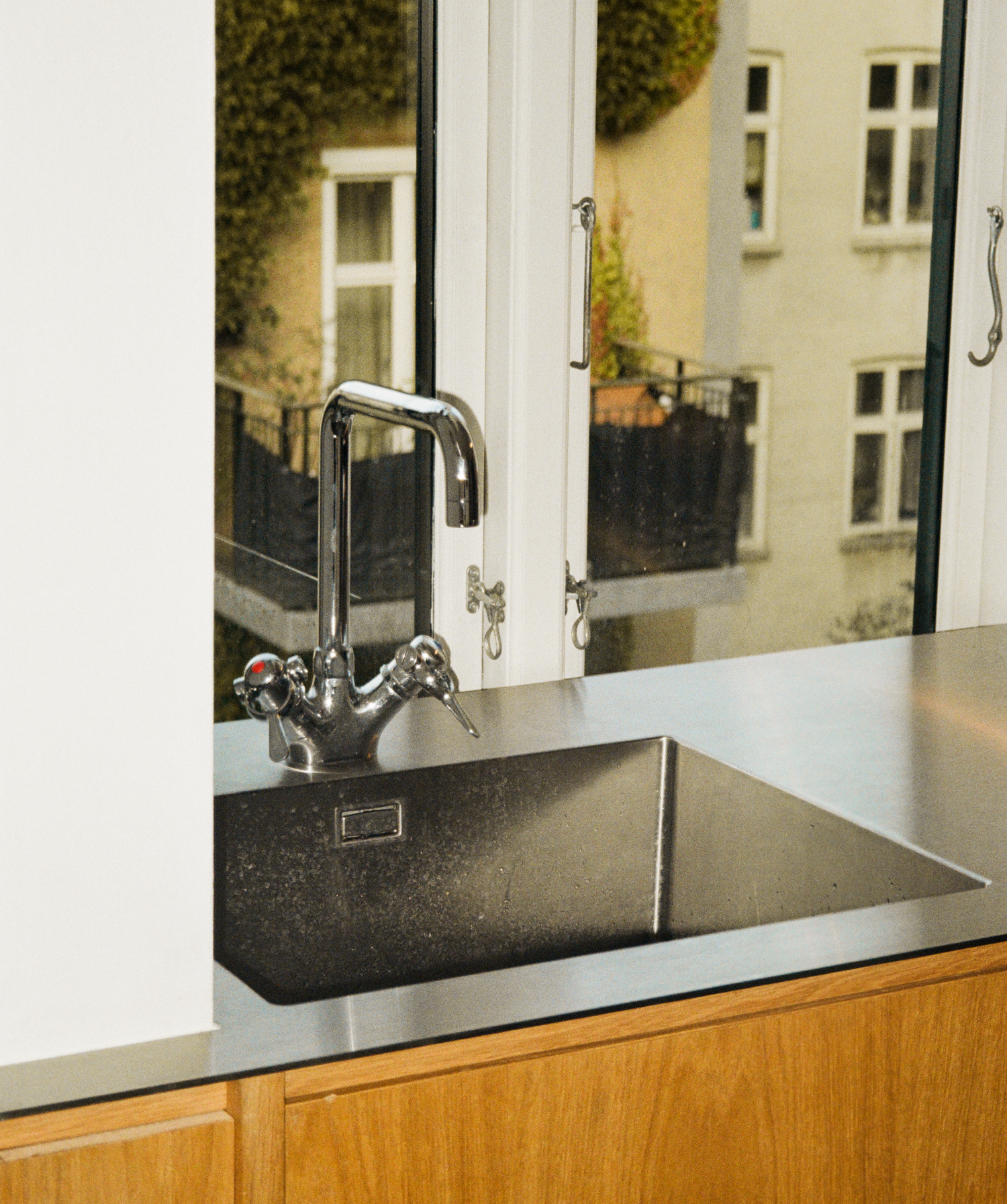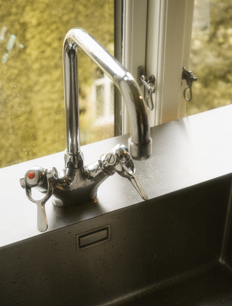 Da alt stod færdigt, manglede kun et køkkenarmatur. Bo syntes, det ville være forkert at sætte en tilfældig vandhane i et køkken, som der var lagt så meget tanke i. I stedet tog han det SP-armatur, der havde stået installeret på han egen tegnestue, og som han havde brugt hver dag i tre årtier. Selv lamperne i køkkenet tog han også med fra tegnestuen over i køkkenet, griner Irene, da hun fortæller.