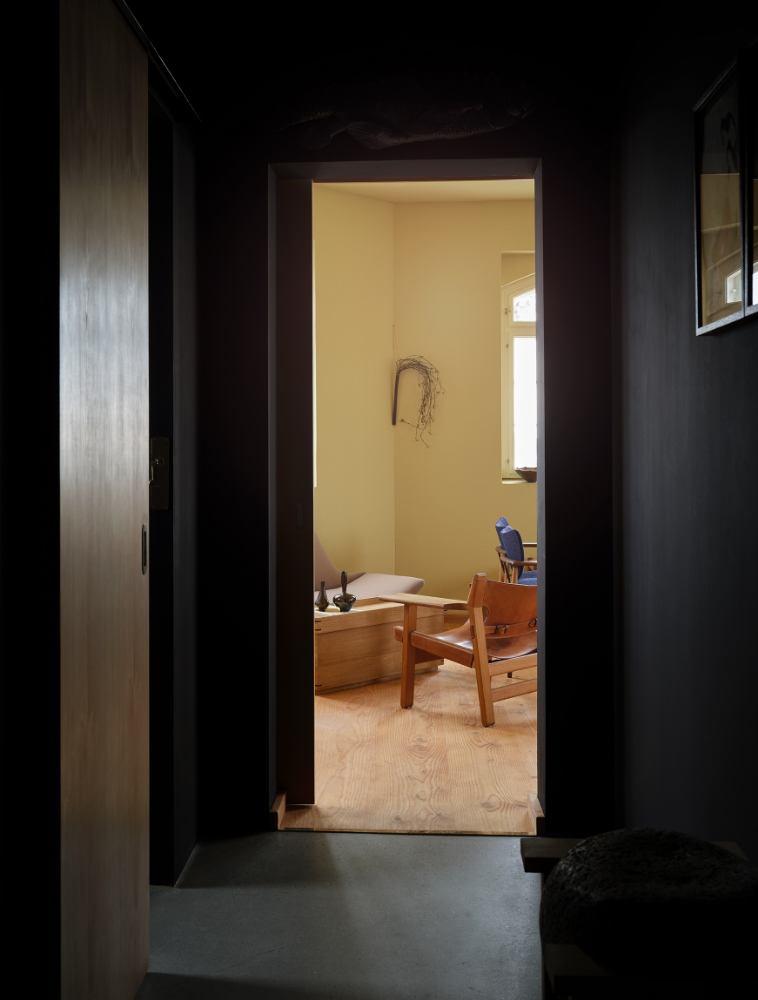 Interiøret er gennemført og minimalistisk, med fokus på ærlige materialer og diskrete funktionelle løsninger. Den centrale spisebar i douglasgran har plads til 15 gæster og danner restaurantens eneste serveringsflade. Rummet er præget af dæmpede farver, naturligt lys og et klart materialemæssigt hierarki, der afspejler den tilgang til detaljer og varighed, som også præger bygningen.